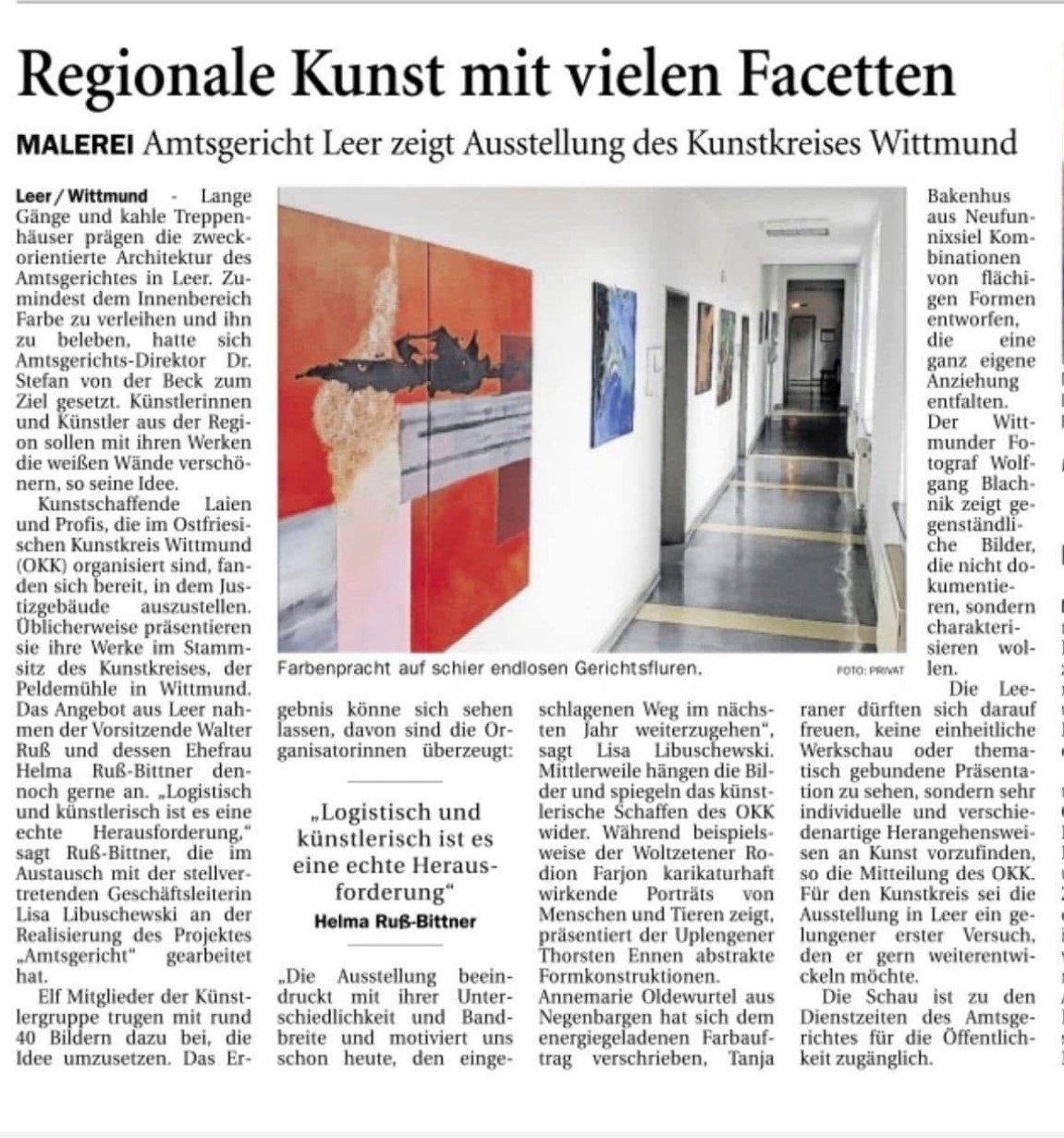 Aufgrund der Kooperation zwischen dem Verein und dem Amtsgericht Leer erhielten elf MitgliederInnen die Möglichkeit, insgesamt knapp 50 Kunstwerke beim Amtsgericht Leer auszustellen. Namentlich beteiligt sind Rodion Farjon, Thorsten Ennen, Annemarie Oldewurtel, Tanja Bakenhus, Wolfgang Blachnik, Helma Ruß-Bittner, Heidi Hurtzig, Nic Schaatsbergen, Sibylle Lange, Klaus Neu und Helge Sachweh. Die Darstellungen reichen von großformatigen, farbstarken sowie expressiven Werken bis hin zu Karikaturen und Fotografien. Einen besonderen Dank möchte die Behörden- und Geschäftsleitung an dieser Stelle an den ehem. Vorstand unter der Leitung von Herrn Ruß und Frau Ruß-Bittner richten, welche mit viel Engagement die Umsetzung dieses tollen Projekts möglich gemacht haben.