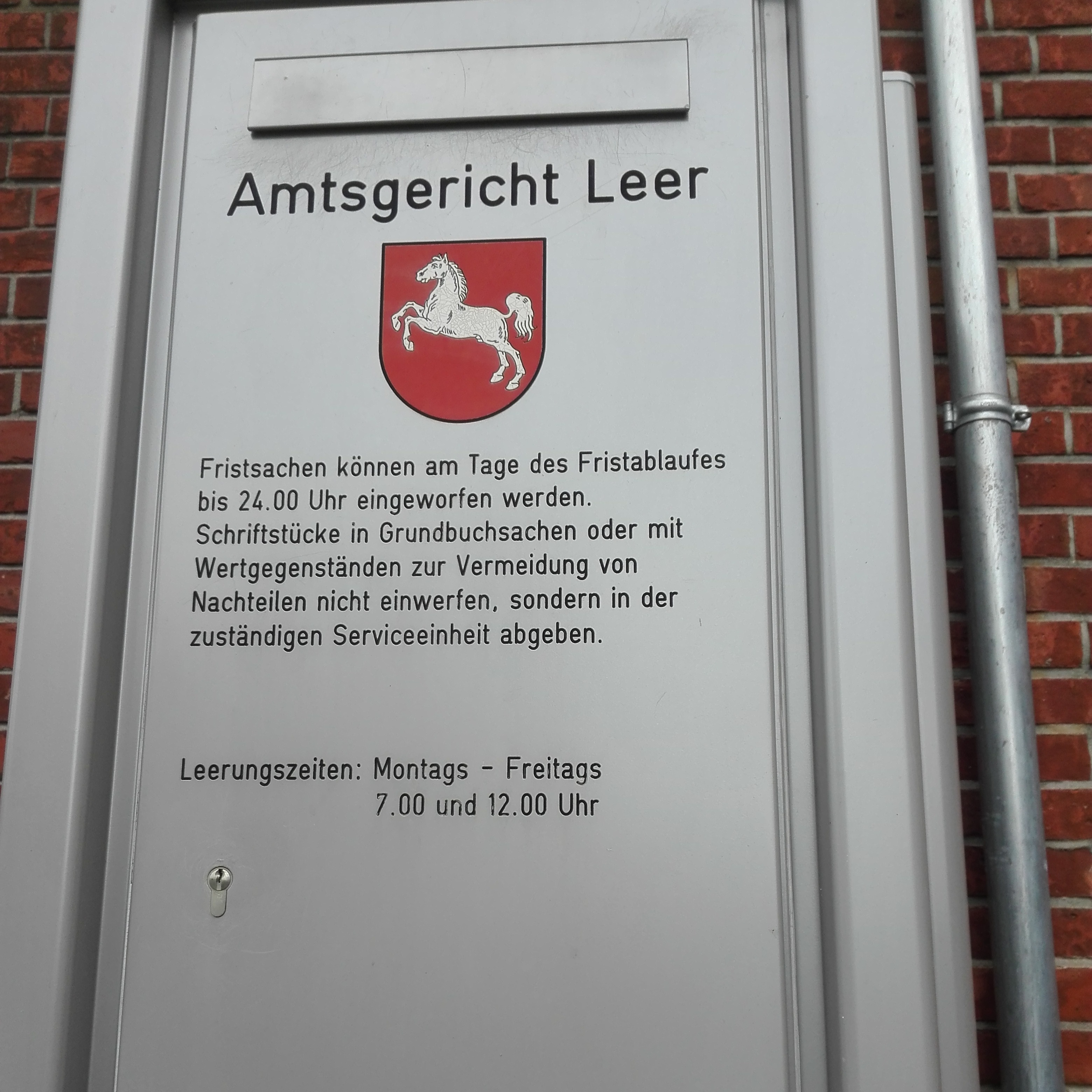 Der Briefkasten des Amtsgerichts Leer befindet sich außen an der rechten Seite des Eingangsportals. Dort haben Sie die Möglichkeit, zu jeder Zeit Briefsendungen und Schriftstücke einzuwerfen. Die besondere Funktionalität des Briefkastens für Fristsachen ermöglicht die taggenaue Feststellung, zu welchem Zeitpunkt der Einwurf erfolgte.
